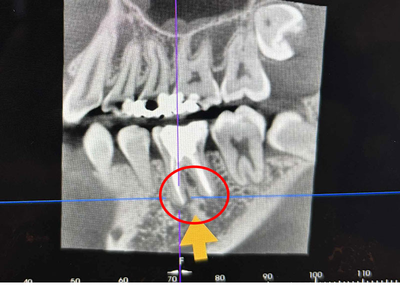 歯科用CTを使用して、歯と歯根の詳細な3D画像を撮影し、正確な診断を行います。CTは根管の形態や歯根破折の有無を判断するのに役立ち、適切な治療計画を作成するためには必要不可欠です。検査結果により、歯根破折が認められる場合は抜歯やインプラント等の代替治療を提案いたします。