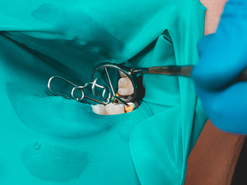 根管治療時にはラバーダムという防湿シートを使用し、治療部位を唾液や血液から隔離することを欠かしません。ラバーダムを使用すれば、無菌的な環境を維持できて、感染リスクを最小限に抑えられます。また、薬液や器具の誤飲も防止できます。